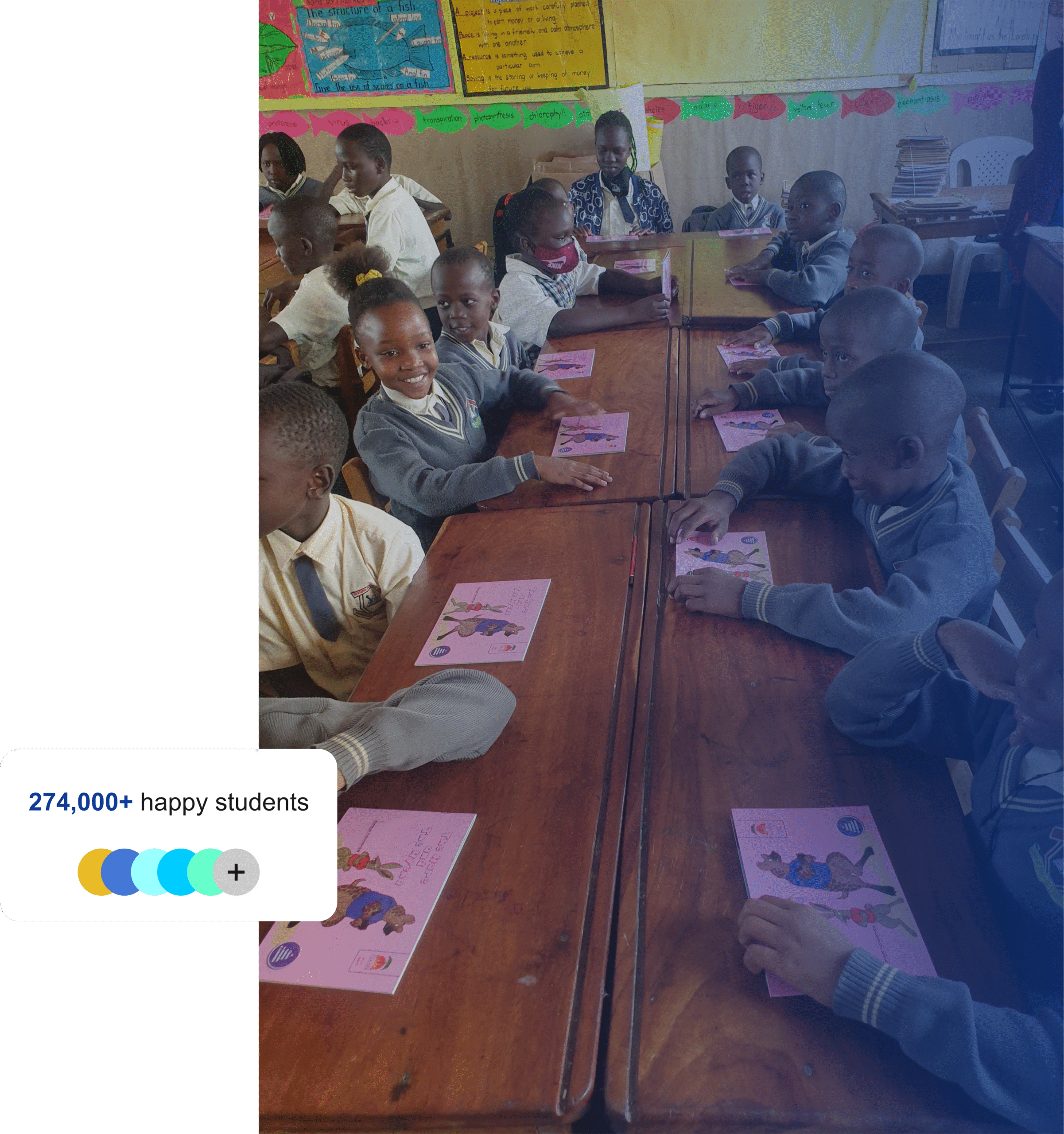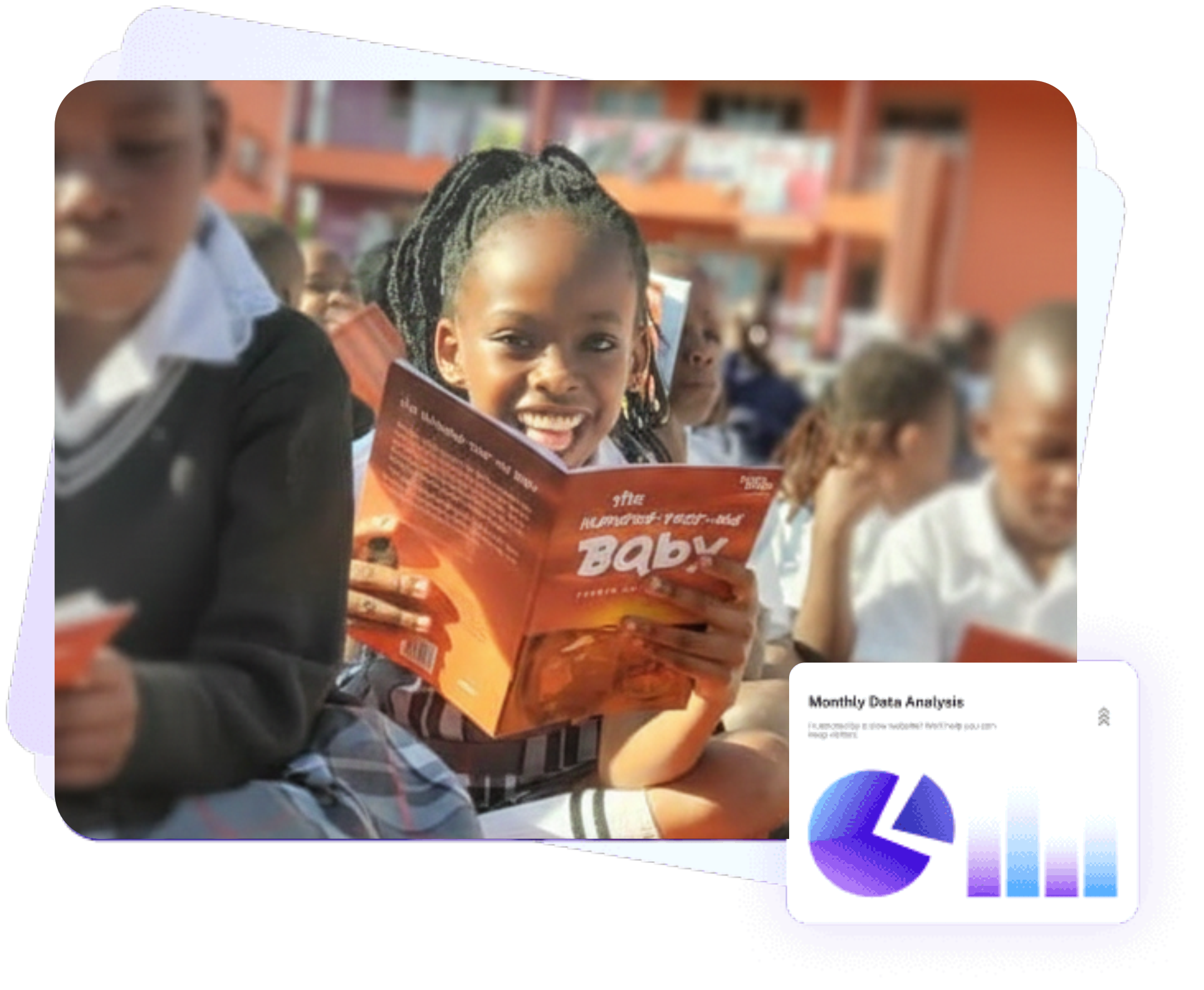 We provide engaging children’s books with African stories , teacher training , comprehensive teaching guides , reading assessments to track progress , and organize reading competitions.